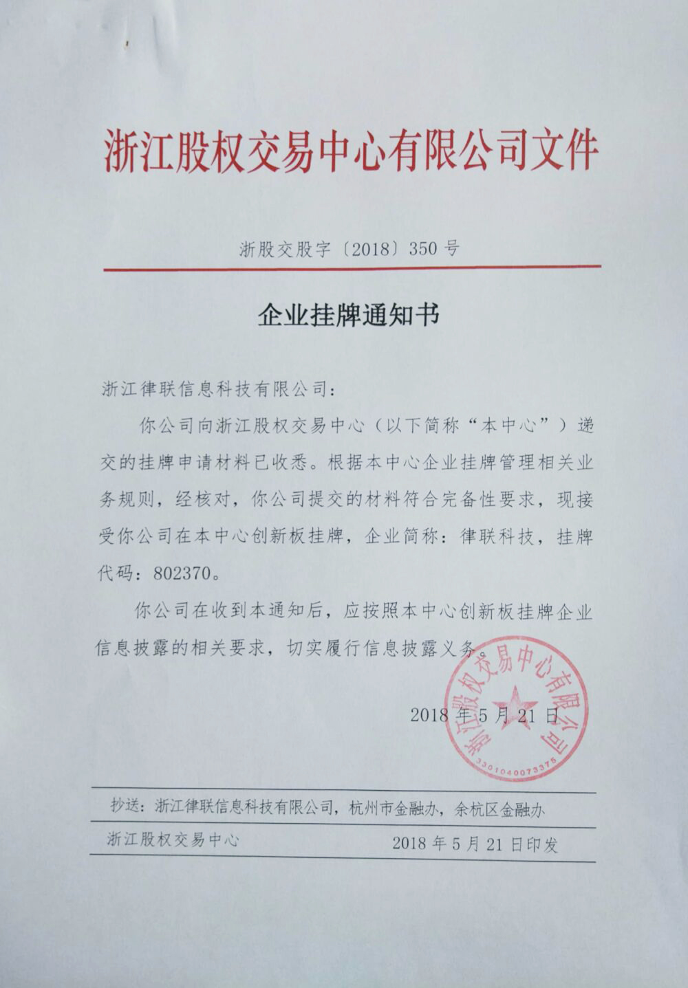 2018年5月21日,根據(jù)浙股交股字[2018]350號(hào)文件,浙江律聯(lián)信息科技有限公司在浙江股權(quán)交易中心成功掛牌,企業(yè)簡(jiǎn)稱:律聯(lián)科技,掛牌代碼:802370。