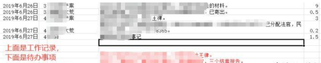 此外,工作記錄表還可以作為待辦事項來使用。當(dāng)律師需要給自己安排一項將來需要完成的任務(wù)時,只需在工作記錄表將來時間的空白處記下該任務(wù),提醒自己需要完成。