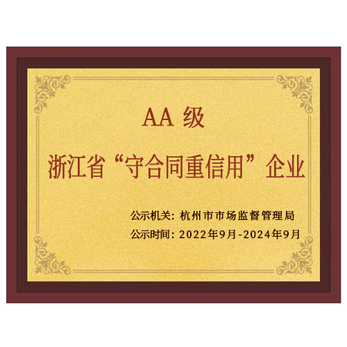 公司在2022年“守合同重信用”評比中,憑借良好的誠信經(jīng)營記錄和合同履約能力,經(jīng)過杭州市市場監(jiān)督管理局審核,榮獲浙江省AA級“守合同重信用”企業(yè)榮譽稱號。